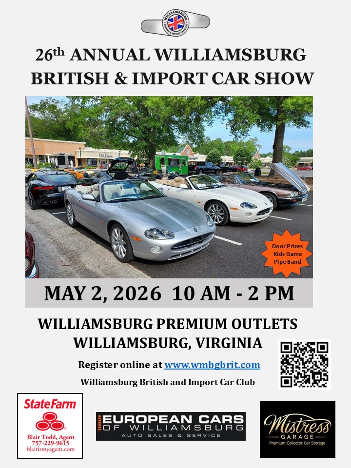 The Williamsburg British and Import Car Club was founded in 1999 to promote and preserve all British Marques. We are based in Virginia’s Historic Triangle of Jamestown, Williamsburg, and Yorktown. Members come from the Hampton Roads region and beyond.